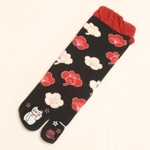 Trage diese japanischen Socken mit den Zehen in zwei Fächer, um deine Füße warm zu halten! Geschmückt mit roten und weißen Kirschblüten werden dir diese freundlichen traditionellen japanischen Socken helfen, Glück anzuziehen. Auf den Zehen befindet sich eine kleine Maneki Neko. Verpasse also nicht die Gelegenheit, diese drei Paar Lucky Tabi Socken zu kaufen!