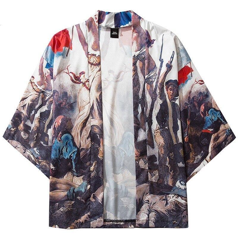 Dieser japanische Haori illustriert ein Schlachtfeld, auf dem Frankreich die Oberhand hat. Dieses japanische Kleidungsstück sieht aus wie ein japanischer Holzschnitt: poetisch und voller Geschichte.