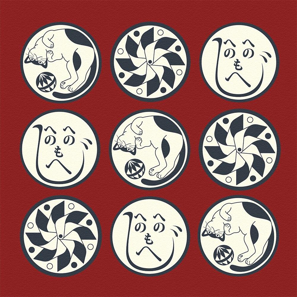 Ein japanisches Furoshiki-Stoff mit einem Katzenbild und anderen Symbolen:
