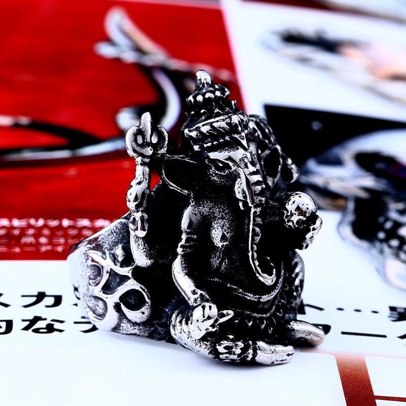 Mit seinem großen Elefantenkopf und der robusten Struktur ist dieser japanische Ganesh-Ring ideal, um einen dezenten asiatischen Streetwear-Stil zu zeigen.