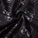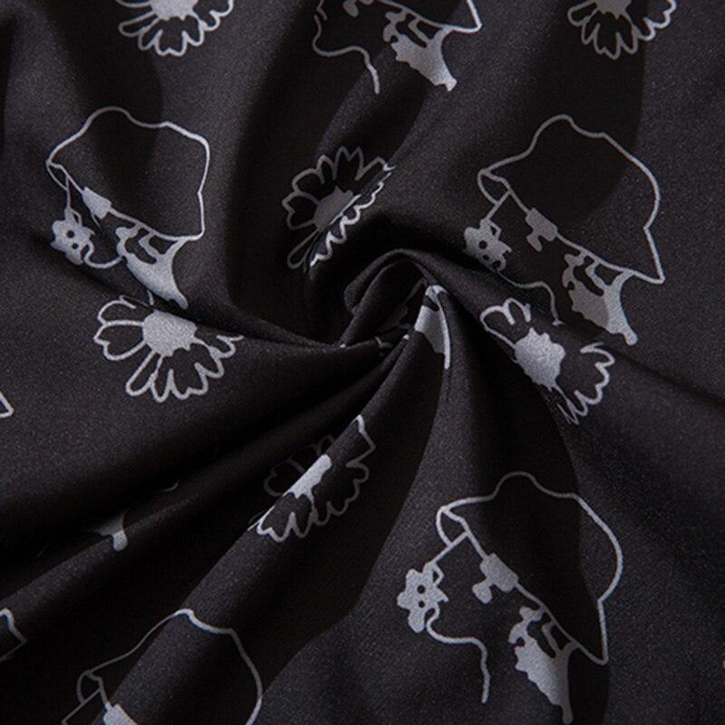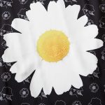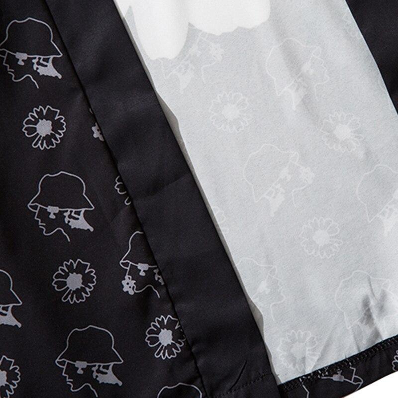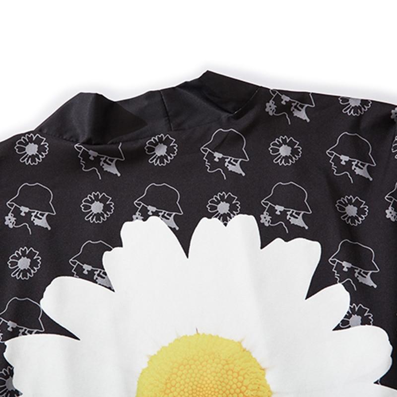 Dieser Kimono-Mantel ist mit einem Muster eines Mannes mit Bob, im Mosaik auf schwarzem Hintergrund, verziert. Und natürlich, in der Mitte und auf der Brust vorne: ein wunderschönes Gänseblümchen.