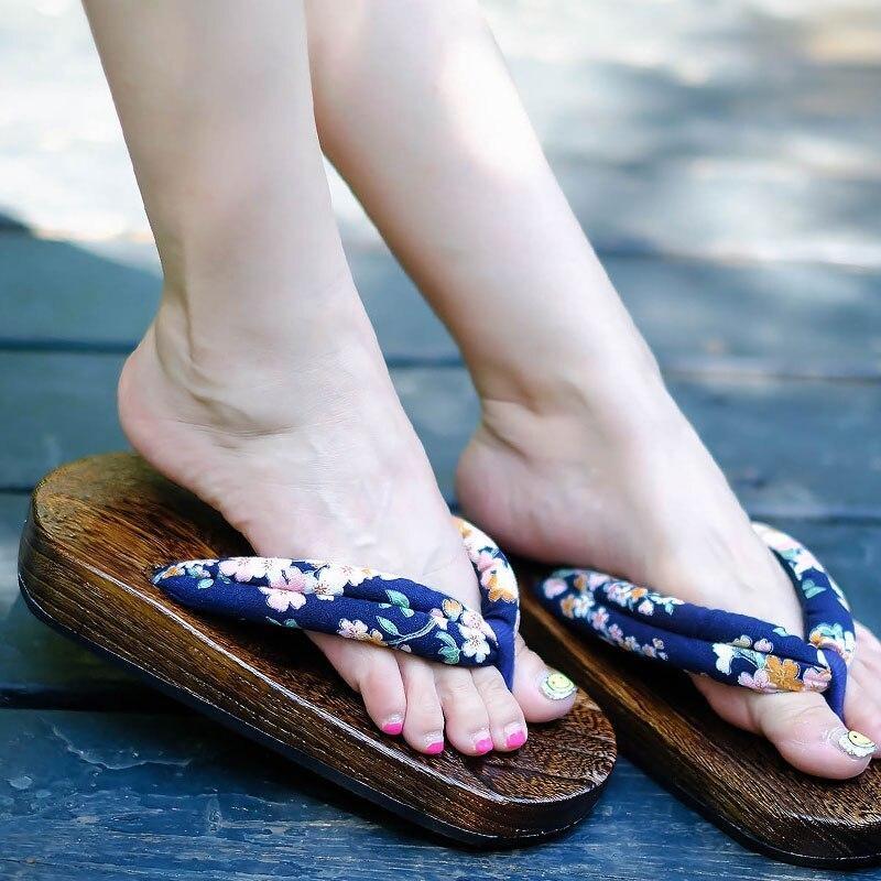 Verleihen Sie Ihrem Sommerlook das ultimative Finish, indem Sie Ihre Füße mit diesen schönen, komfortablen und langlebigen flachen japanischen Geta kleiden. Das blumige Band ist mit Kirschblüten verziert und bildet so einen schönen Kontrast zur lackierten Holzsohle.