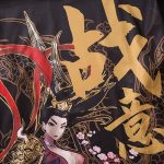 Die Kriegerin in diesem japanischen Mantel trägt eine leichte Samurai-Rüstung, mit einem Oni (Dämon) auf der rechten Schulterpanzerung.