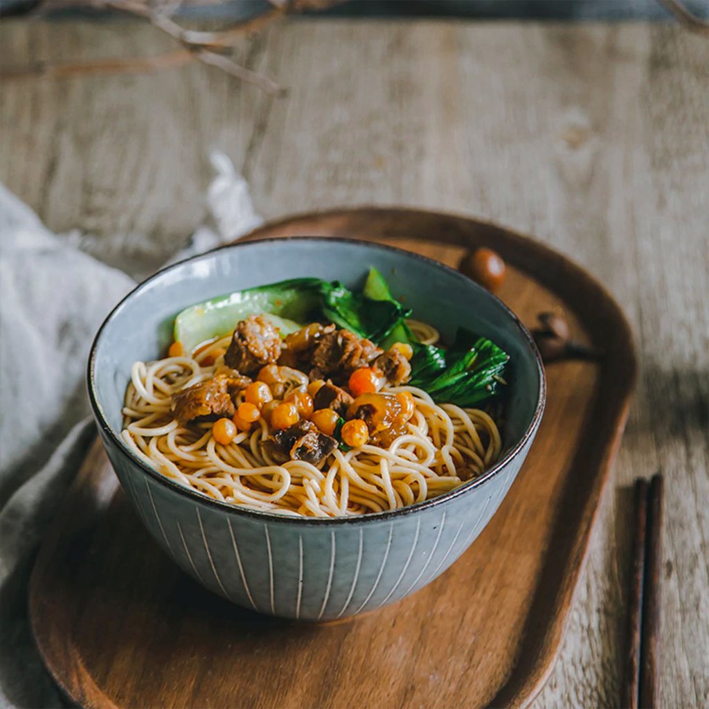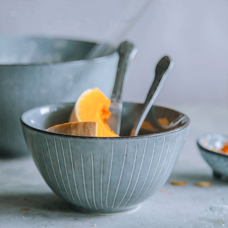 Diese Schüssel aus Keramik hat einen Retro-Stil und eine grau gestreifte Farbe, mit der verschiedene traditionelle japanische Gerichte auf elegante Weise präsentiert werden können.