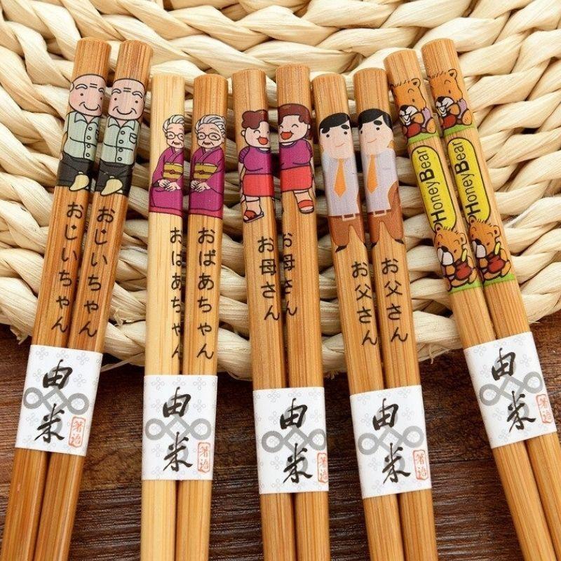 Wählen Sie dieses Set japanischer Essstäbchen aus Bambus, bedruckt mit einer glücklichen japanischen Familie am Griff.