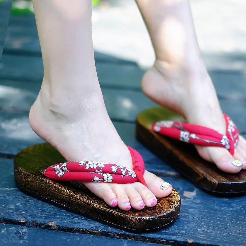 Geben Sie Ihren Füßen das Beste vom Besten mit diesen wunderschönen japanischen Geta für Damen mit einer dicken flachen Sohle. Der rote Stoffriemen ist wunderschön mit Pflaumenblüten verziert, um Ihrem sommerlichen Look einen blumigen Akzent zu verleihen. Die rutschfeste Gummibeschichtung unter der Sohle hilft, den Holzverschleiß zu reduzieren und Geräusche zu dämpfen.