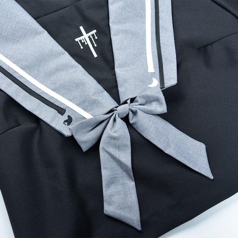 Wenn du dich auch als ein japanisches Mädchen von der Oberschule verkleiden möchtest, bereit für die Schule, dann wird dir unser zweiteiliges Schuluniform mit einem Shirt mit einem Abzeichen auf der Schulter, einer Krawatte und einem Rock gefallen!