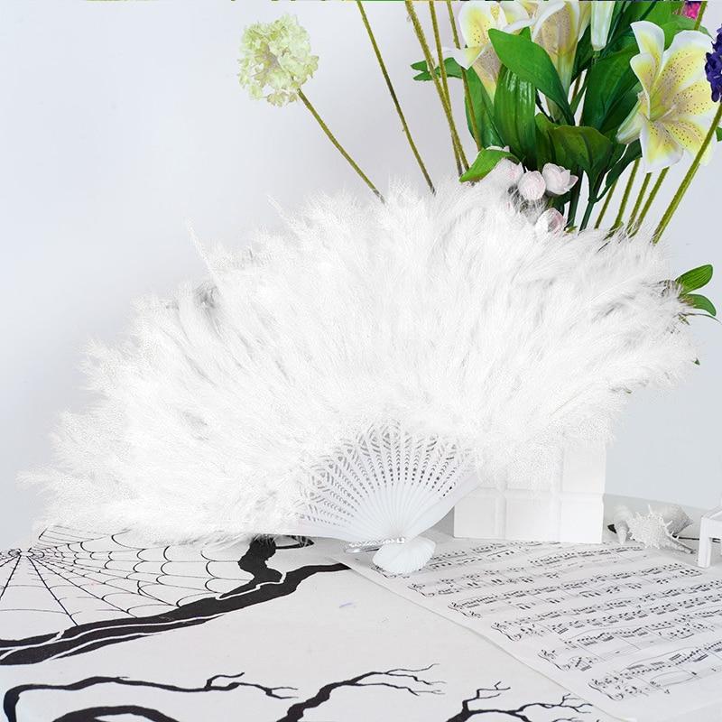 Wagen Sie es, schick und hervorragend zu sein mit diesem wunderschönen japanischen Fächer mit majestätischen weißen Federn. Die Bambusstruktur ist von überlegener Qualität und sorgt für ein sanftes Öffnen und Schließen.