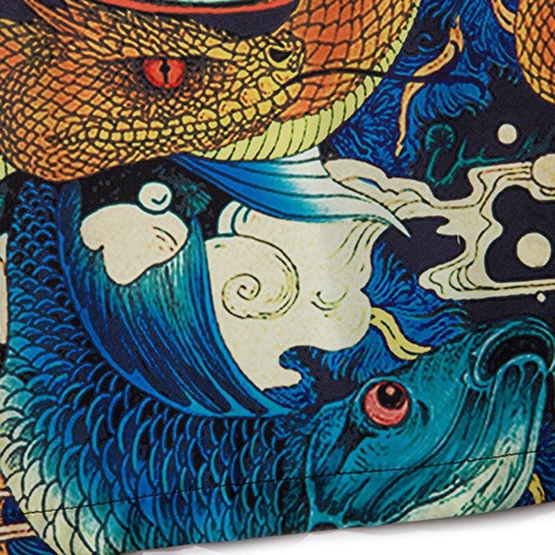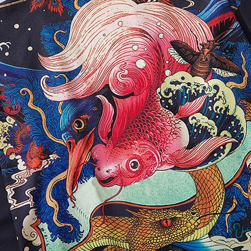 Auf dieser Haori-Jacke aus unserer Kollektion sehen Sie einen Koi-Karpfen und eine Schlange. In der japanischen Folklore bringt der Koi Glück und ist ein Zeichen für Durchhaltevermögen.