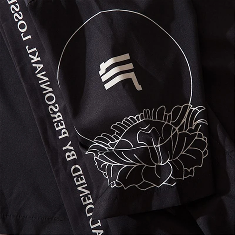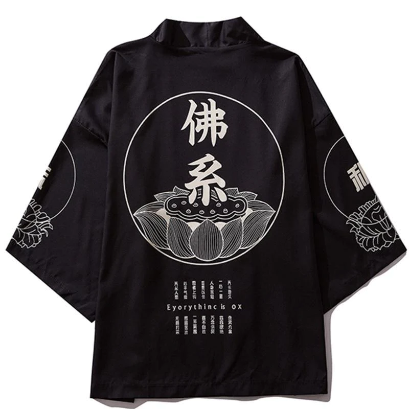 Dieser japanische Haori zeigt eine wunderschöne Kanji-Kalligrafie. Die Lotusblume ist ebenfalls ein wichtiges Symbol in Japan. Sie gehört zur urbanen Kultur und Streetwear der japanischen Pops.
