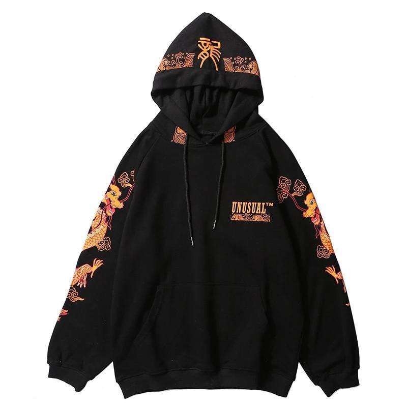 Die Muster auf diesem Japanischen Hoodie für Herren imitieren die Bewegungen des japanischen Drachen. Mit diesem japanischen mythologischen Wesen auf beiden Ärmeln und seinem Design, das sich auf die Kapuze fortsetzt, ist die japanische Herkunft dieses Hoodies unbestritten.
