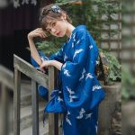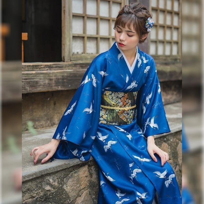 Ein schöner blauer Kimono mit japanischen Kranichen und einigen zusätzlichen Accessoires: