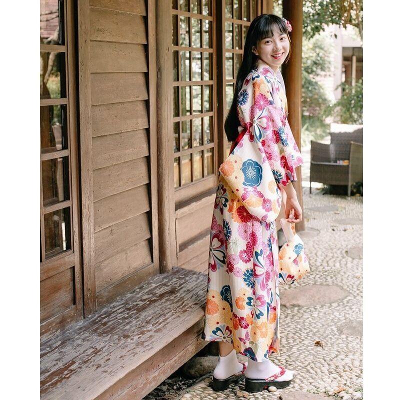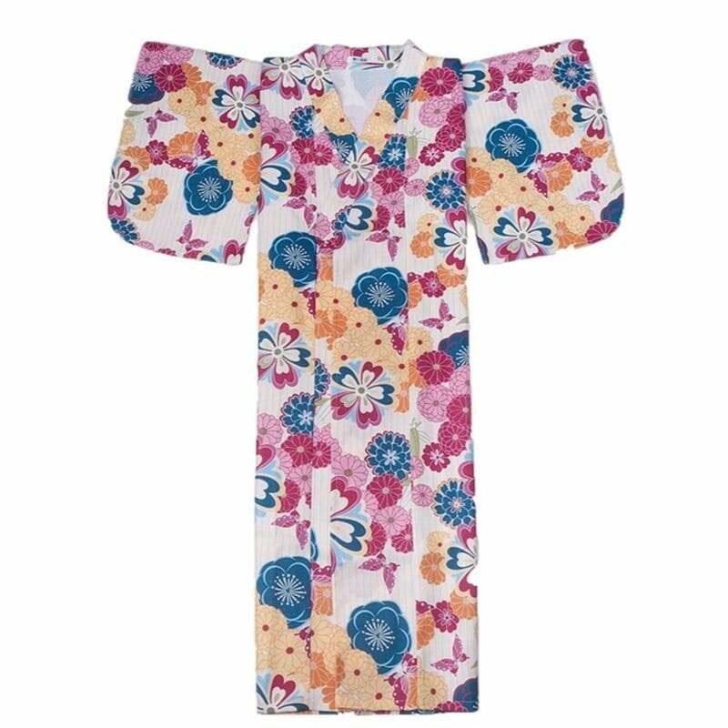 Ein schöner weißer Yukata mit bunten Blumen: