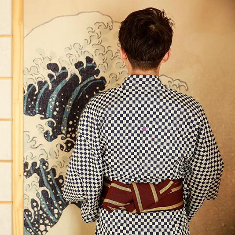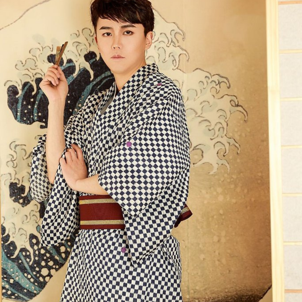 Ein schöner Herren-Kimono mit einem Karomuster, eine strategische Wahl: