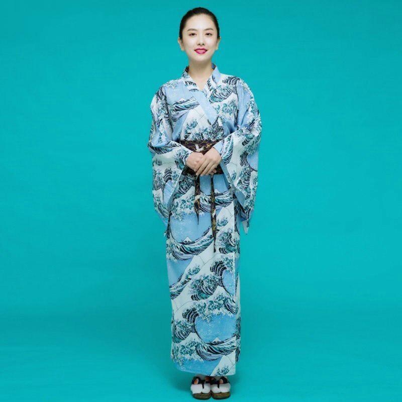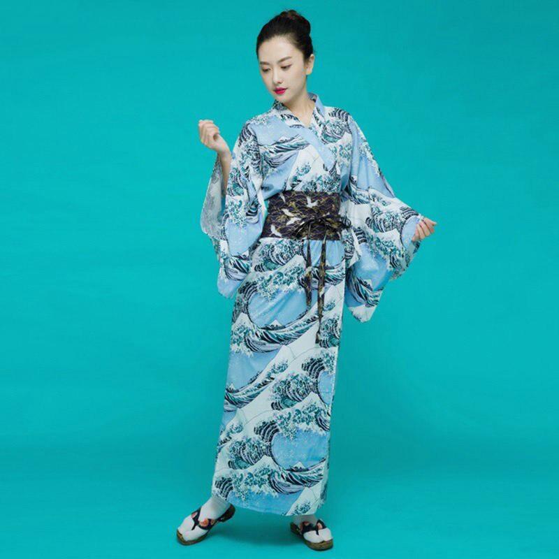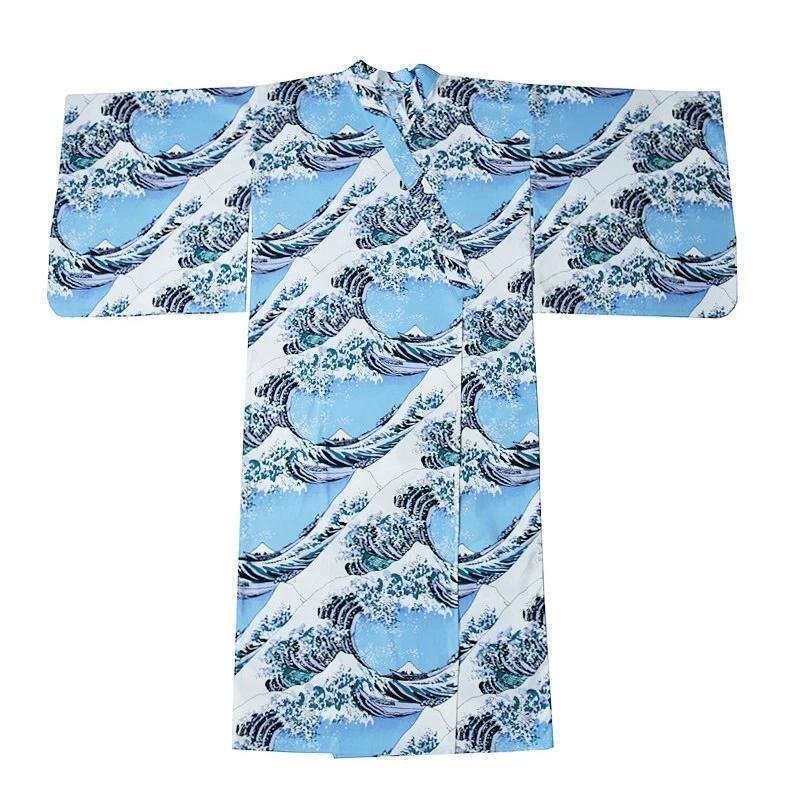 Die Motive auf diesem Kimono sind inspiriert von der Großen Welle von Kanagawa, einem berühmten japanischen Holzschnitt aus dem 19. Jahrhundert, der die Zeit überdauert hat und noch immer ein großes Symbol der japanischen Kultur ist.