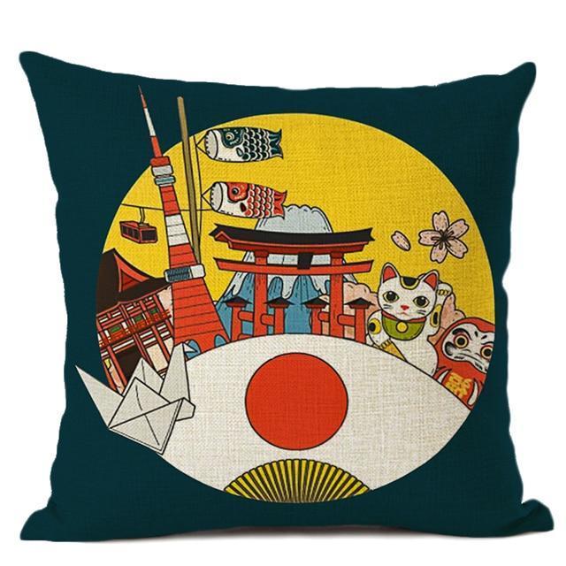 Bieten Sie diesen Kissenbezug für einen japanischen Fächer an und Sie werden garantiert zufrieden sein! Auf dem Druck sind viele symbolische japanische Elemente wie der Tokyo Tower, ein Fächer oder ein Maneki Neko zu sehen.