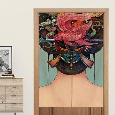 Eine wunderschöne Vorhangtür mit einer japanischen Frau und einem schönen Kanzashi-Fisch in ihrem Haar: