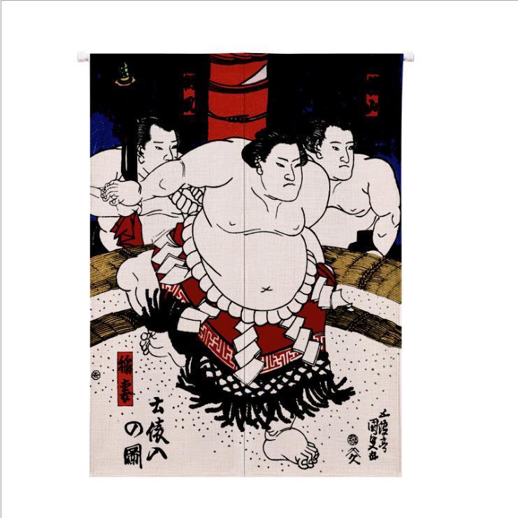 Sumo ist eine heilige und symbolische Sportart in Japan. In diesem Japanischen Noren-Vorhang sehen wir einen Sumo-Ringer in der Mitte des Ringes, bereit zu kämpfen und unterstützt von zwei anderen Sumo-Ringern hinter ihm.