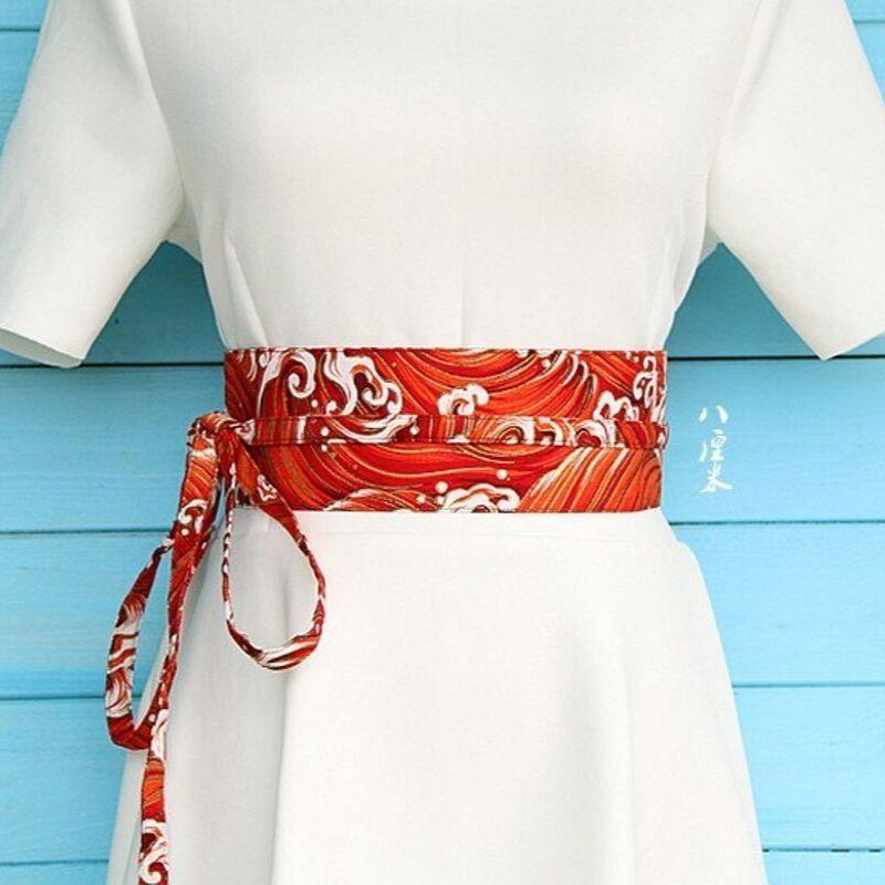 Dieser rote Obi-Gürtel hat ein sehr feines japanisches Muster und wird wunderschön über einem kleinen schwarzen Kleid oder einem hoch taillierten Rock aussehen.