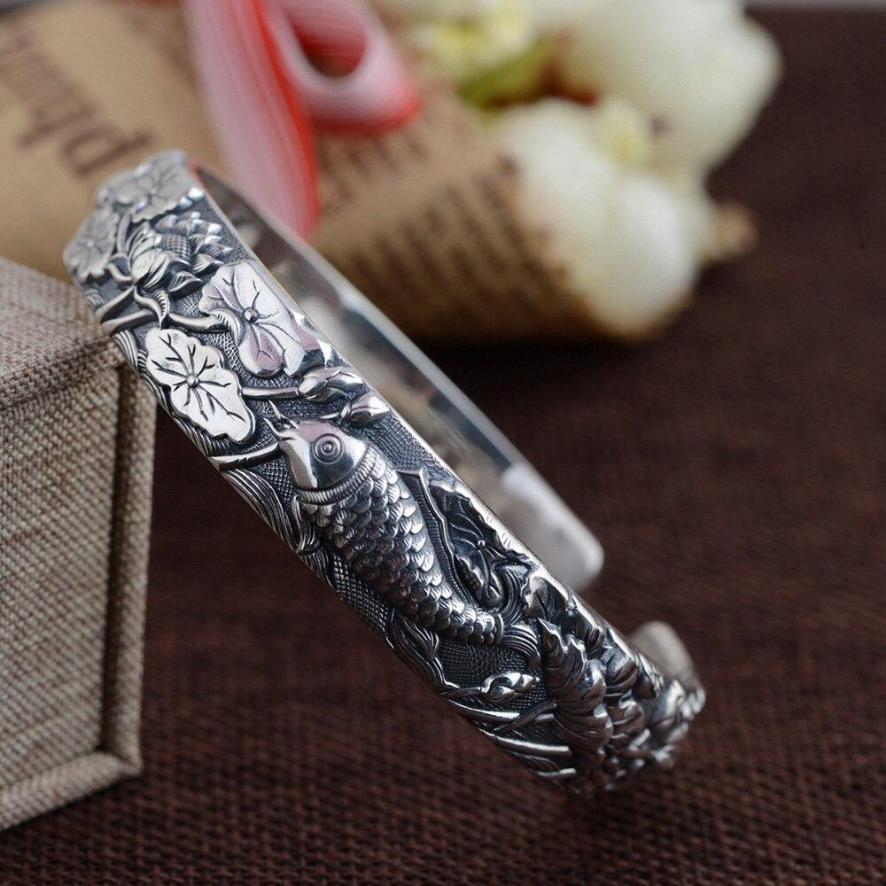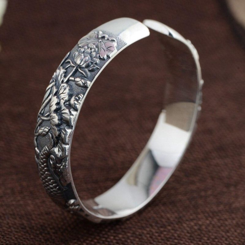 Ein Silberarmband mit dem Bild einer Lotusblume und einem Karpfen: