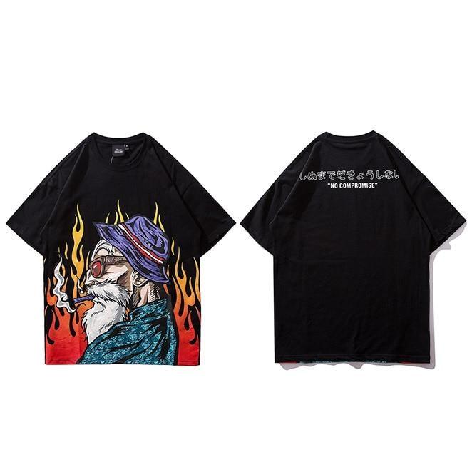 Auf diesem japanischen T-Shirt ist eine coole Version eines alten Mannes abgebildet, der eine Zigarre raucht, vor einem Hintergrund aus Flammen.