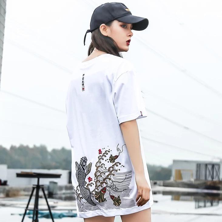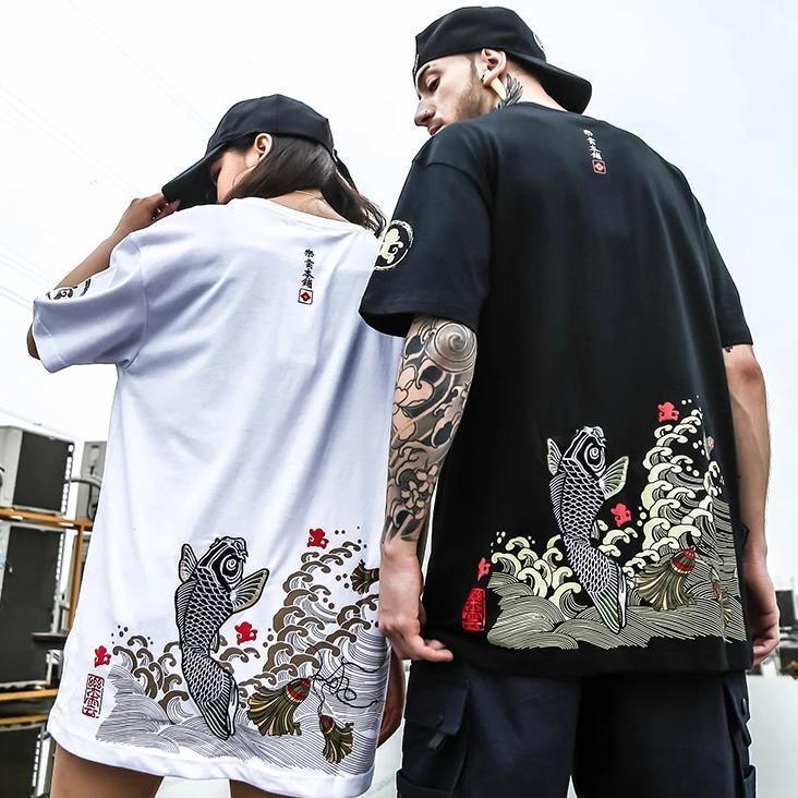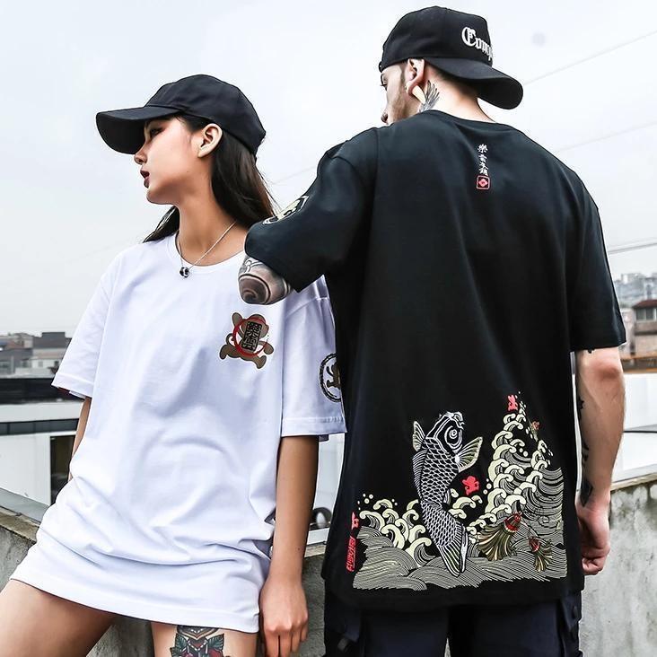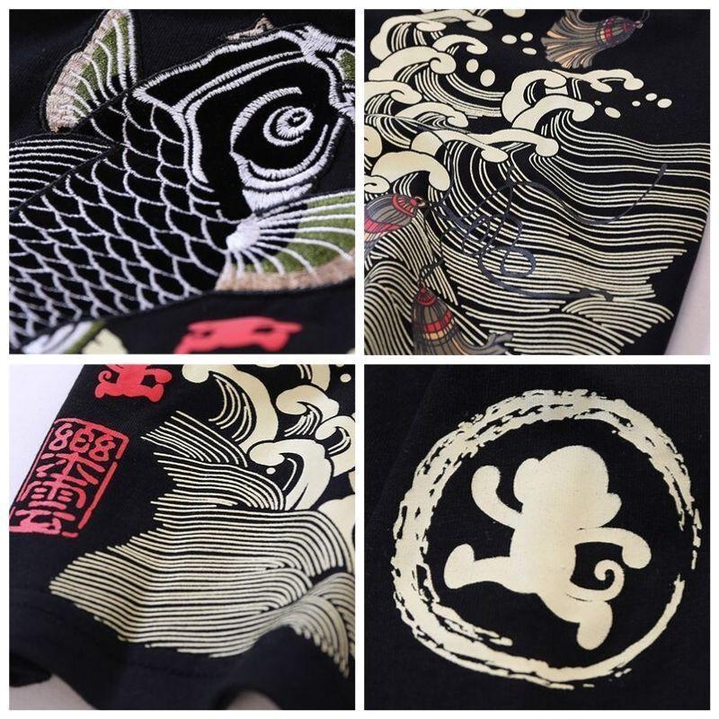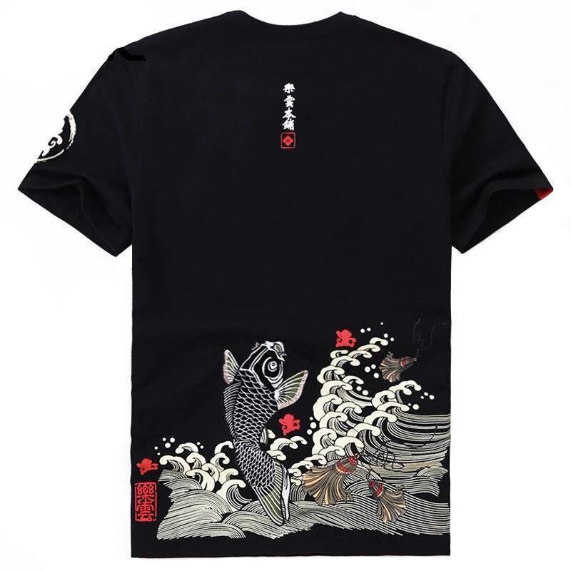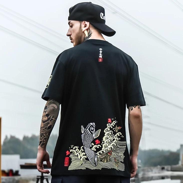 Ein japanisches Streetwear-T-Shirt bestickt mit einem Koi-Karpfen: