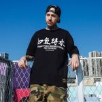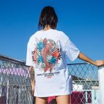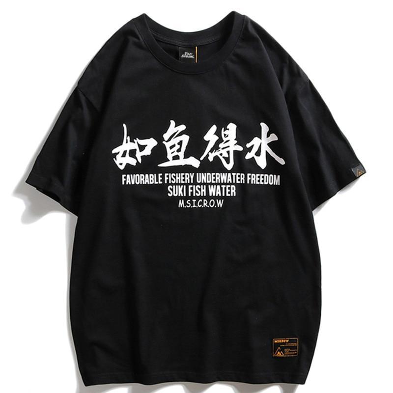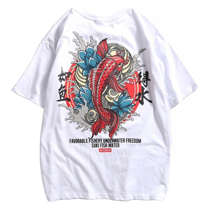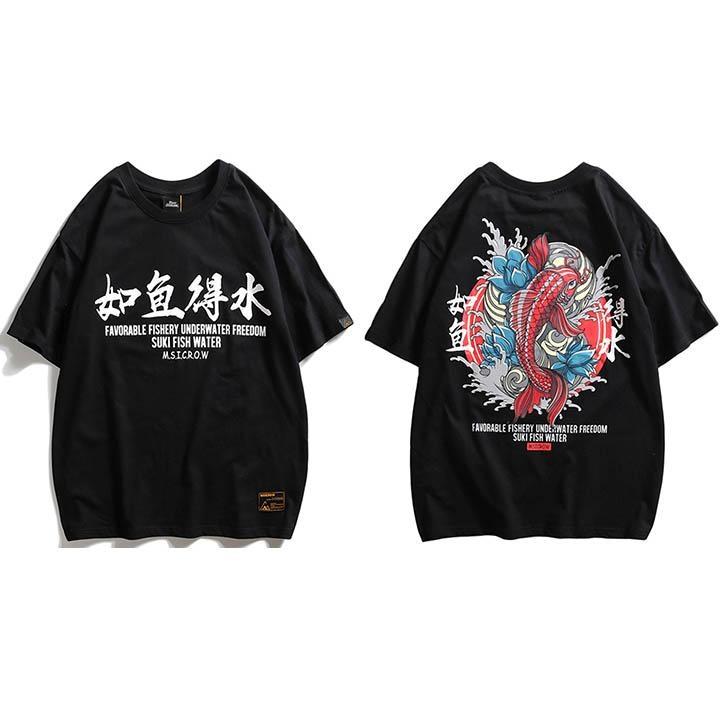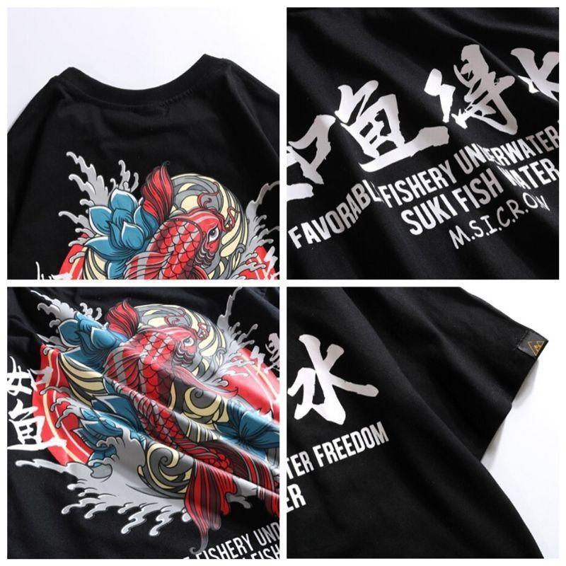 Um einen einzigartigen und originalen japanischen Look zu kreieren, tragen Sie dieses Baumwoll-T-Shirt mit einem Aufdruck eines Koi-Karpfens, der gegen die Strömung kämpft, umgeben von Lotusblumen. Die Farben des Prints sind lebhaft und der Stoff ist dick und weich, um optimalen Komfort zu bieten.