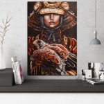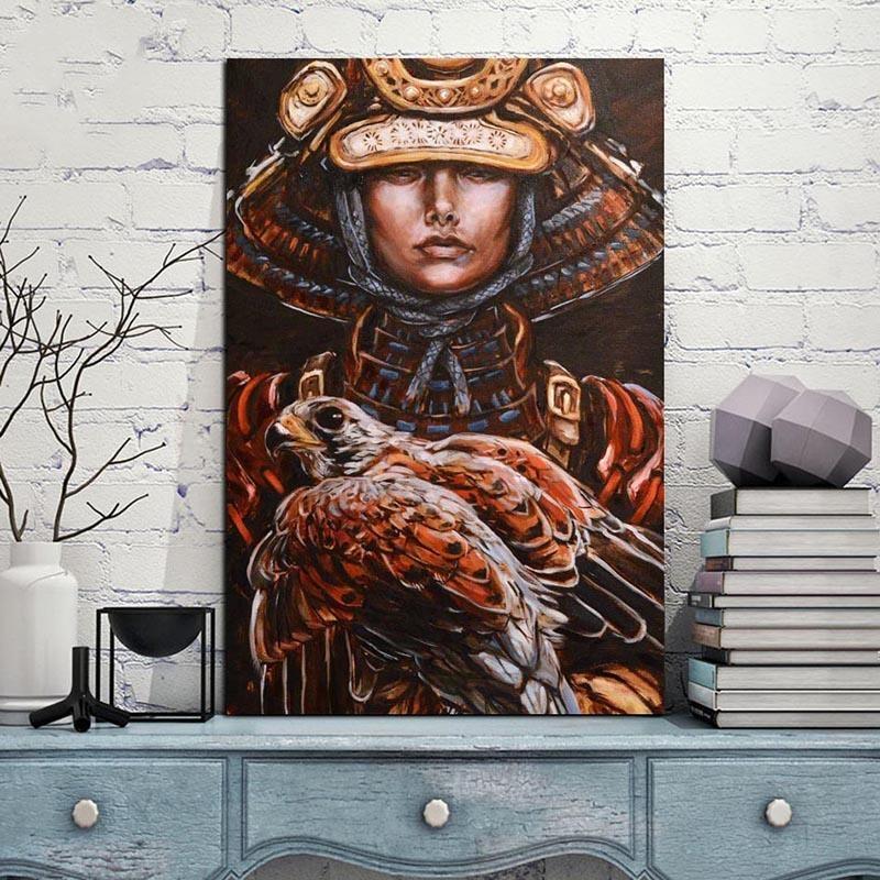 Auf diesem Leinwanddruck ist eine Samurai-Frau in beeindruckender Rüstung mit einem Falken auf ihrem Arm dargestellt.
