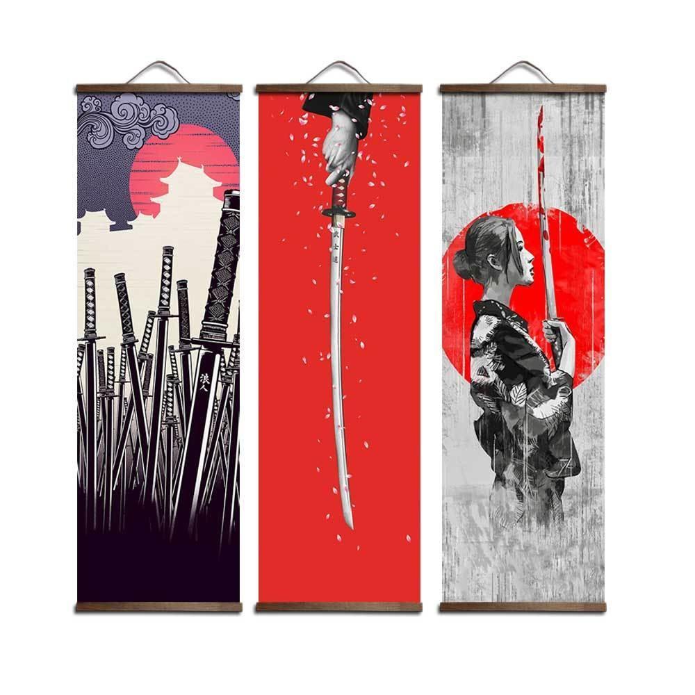 Für dich könnte unser Gemälde mit drei japanischen Motiven interessant sein, auf dem ein Katana-Feld, ein Katana allein und eine Kriegerin, ebenfalls mit einem Katana ausgestattet, abgebildet sind.