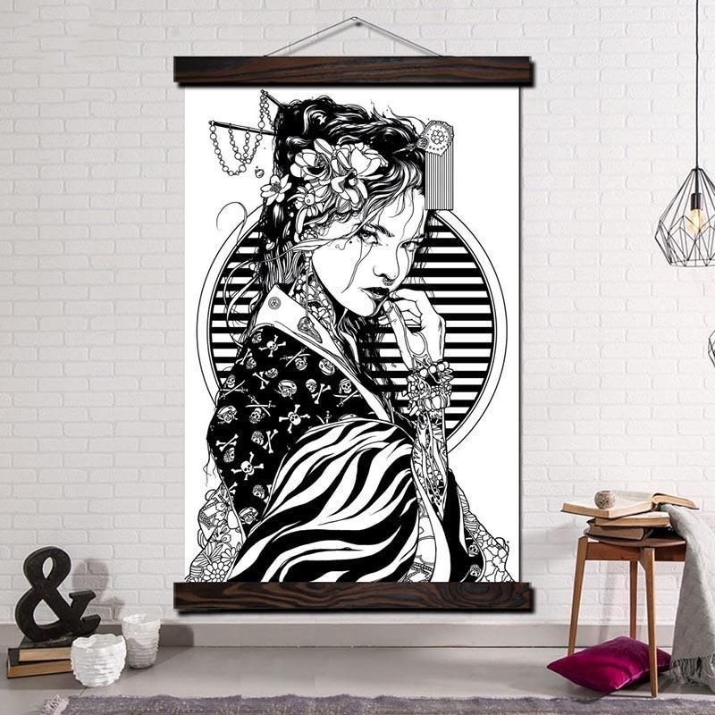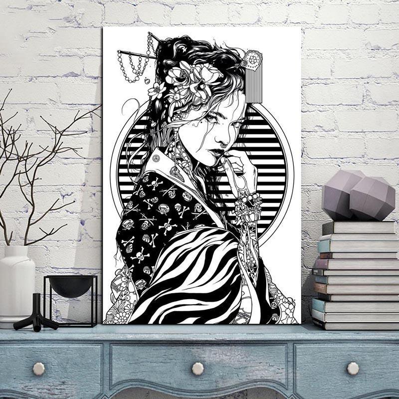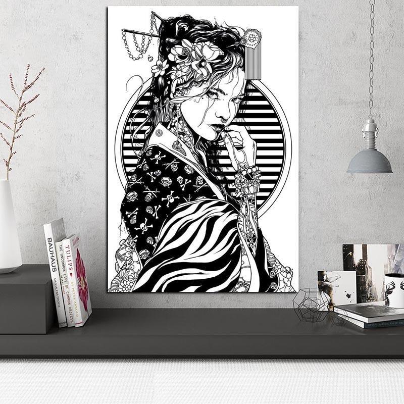 Verleihen Sie Ihrer Einrichtung einen künstlerischen Touch mit diesem japanischen Gemälde einer modernen Geisha in Schwarz und Weiß.
