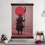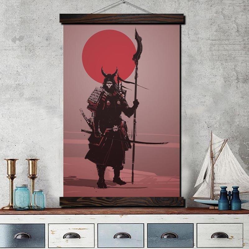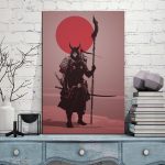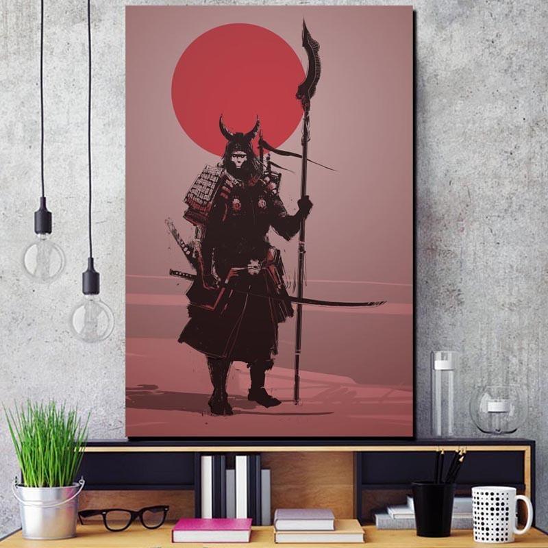 Verleihen Sie Ihren Wänden einen bunten Akzent, indem Sie dieses japanische Poster mit einem Samurai bei Sonnenuntergang aufhängen.