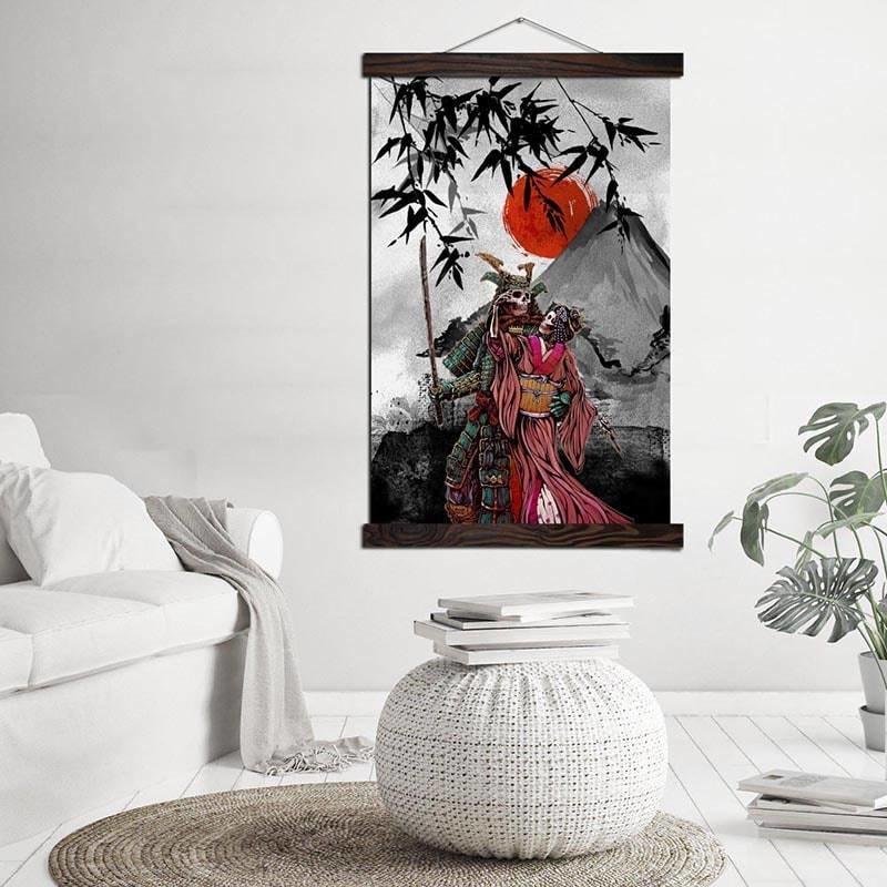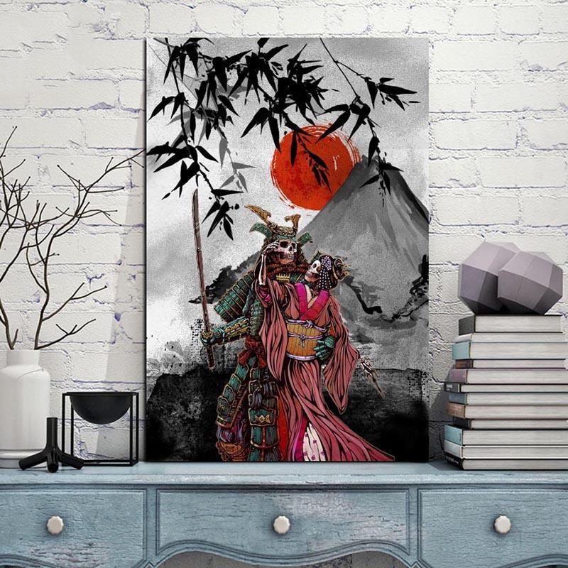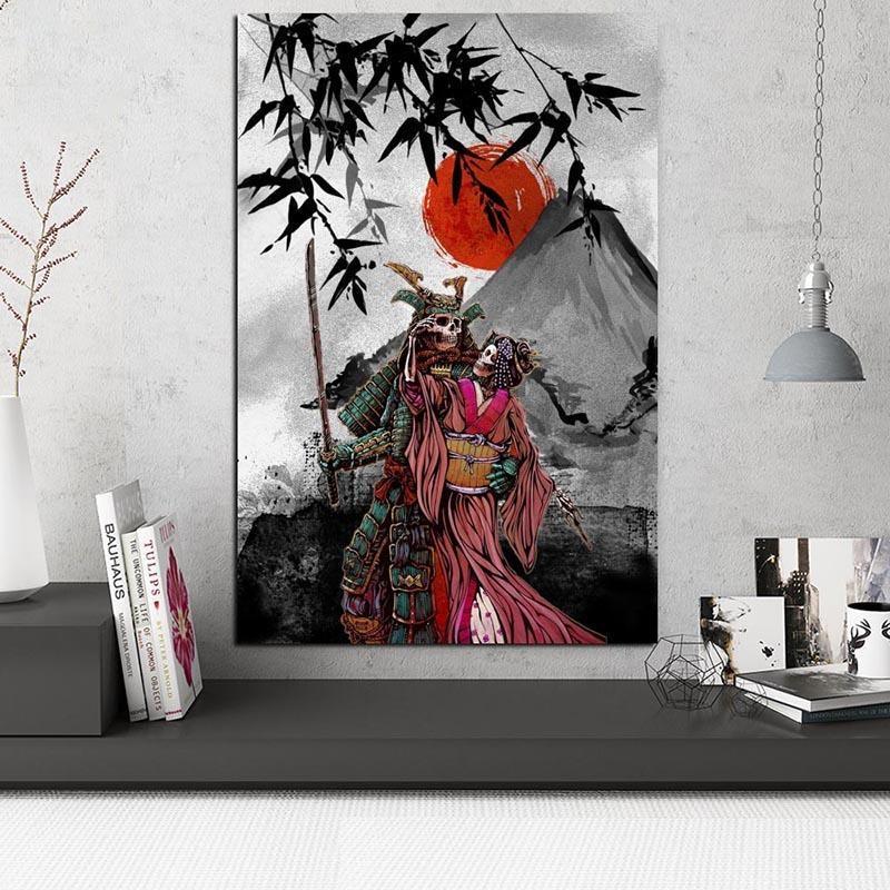 Sorgen Sie für ein bemerkenswertes Interieur mit diesem japanischen Gemälde, das ein atypisches Paar zeigt, bestehend aus einem Samurai und einer Geisha, die aus dem Tod zurückkehren.