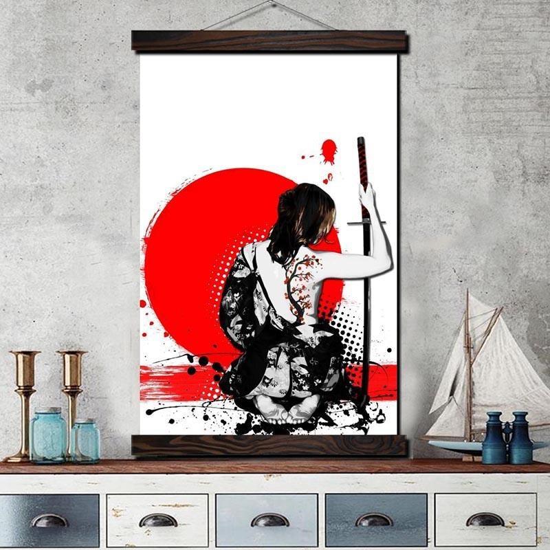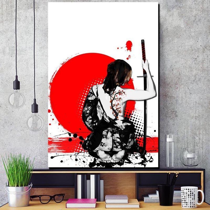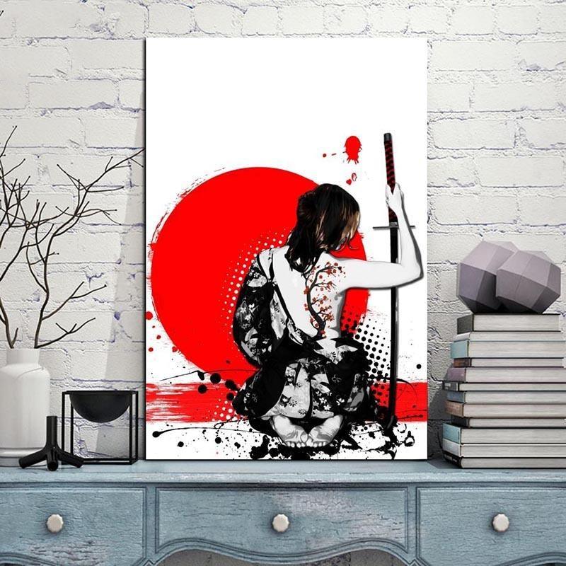 Sorgen Sie für eine einzigartige Dekoration mit diesem japanischen Gemälde einer nackten Frau, die neben ihrem Katana vor einer riesigen roten Sonne kniet.