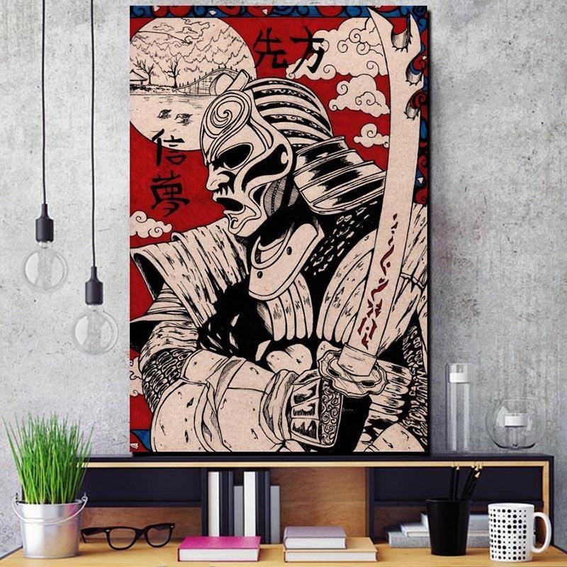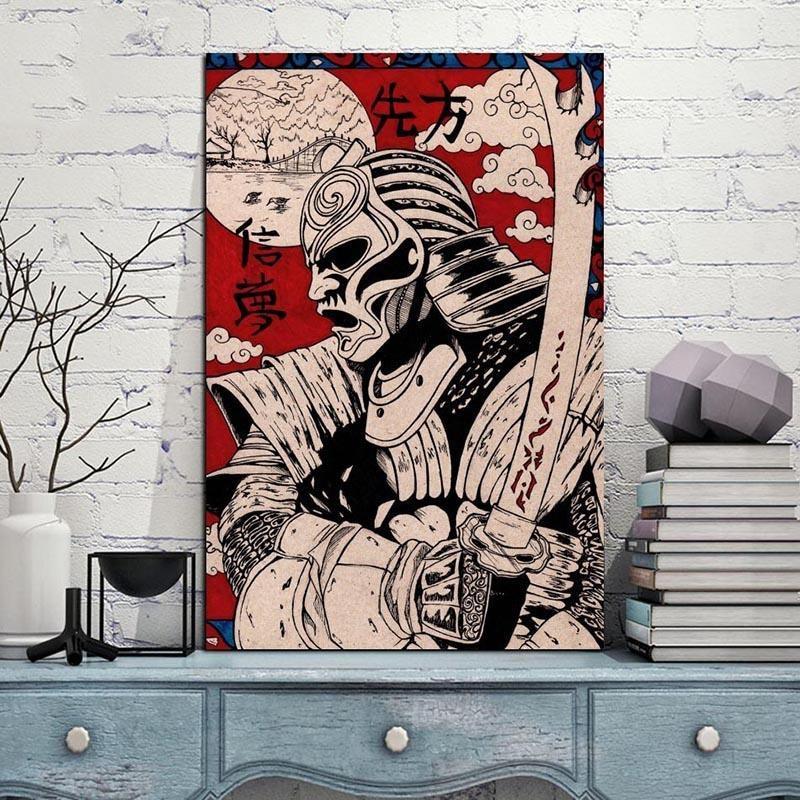 Zeigen Sie stolz Ihre Leidenschaft für die japanische Kultur mit diesem japanischen Gemälde eines Samurai in voller Rüstung, bereit für den Kampf.