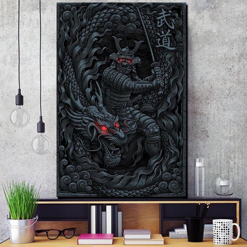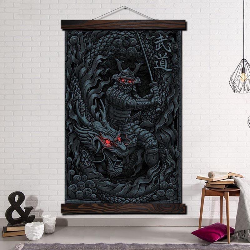 Gestalten Sie Ihre Einrichtung einzigartig und originell mit diesem japanischen Gemälde, das das Bild eines Samurai und eines östlichen Drachen zeigt.