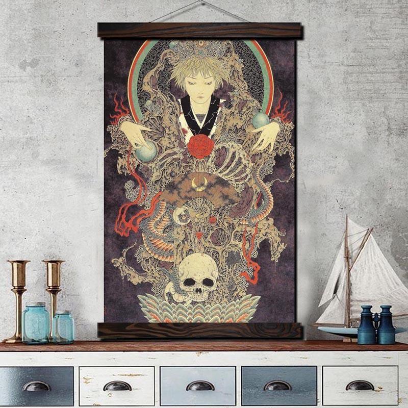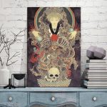 Mit seinen trüben Farben und finsteren Mustern bringt dieses japanische Todesgötter-Gemälde Charisma und Persönlichkeit in Ihr Wohnzimmer.