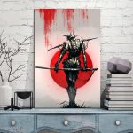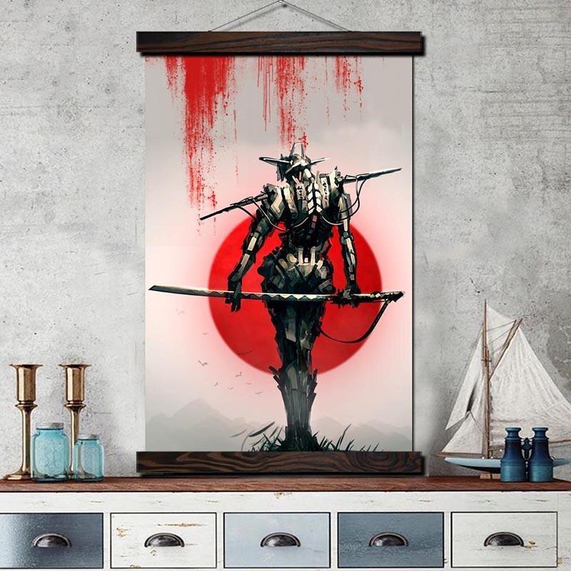 Verleihen Sie Ihrer Einrichtung Charakter mit diesem japanischen Gemälde, das eine futuristische Version eines Samurai zeigt, der vor einer riesigen roten Sonne steht.