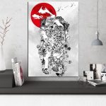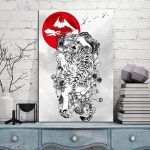 Auf diesem Leinwanddruck sind ein mächtiger Tiger, der Fuji-Berg und die berühmte rote Sonne abgebildet.