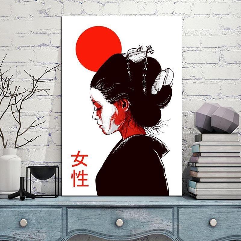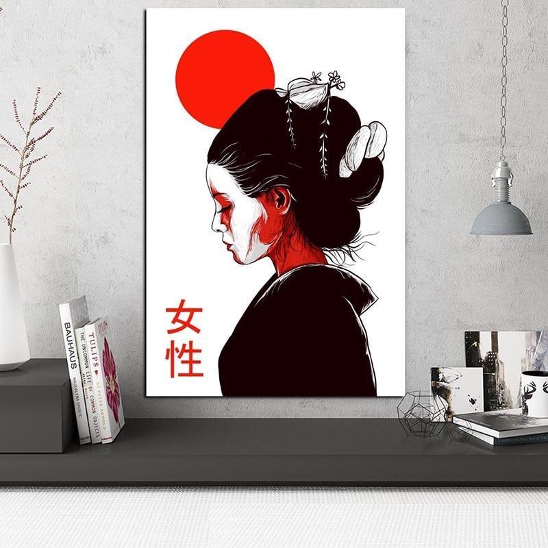 Auf diesem japanischen Leinwandbild ist eine Geisha mit einem blutroten Gesicht ein Geheimnis. Der Stoff der Leinwand sorgt für einen hochwertigen Druck mit perfekter Farbintensität für eine wunderschöne Reproduktion.