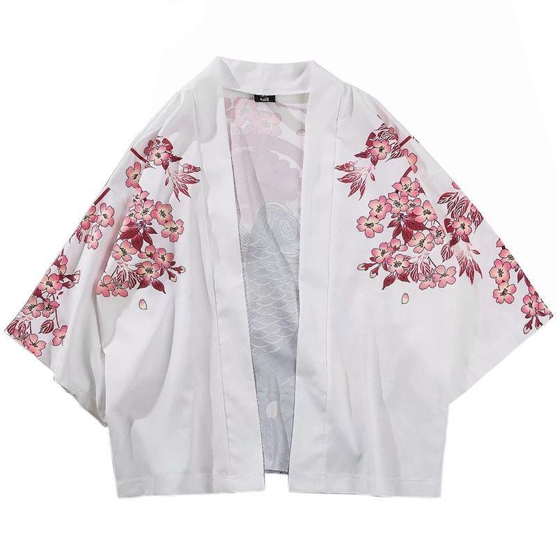 Ein weißer Kimono Haori mit einem Koi-Karpfen, einem Wasserfleck und Kirschblüten: