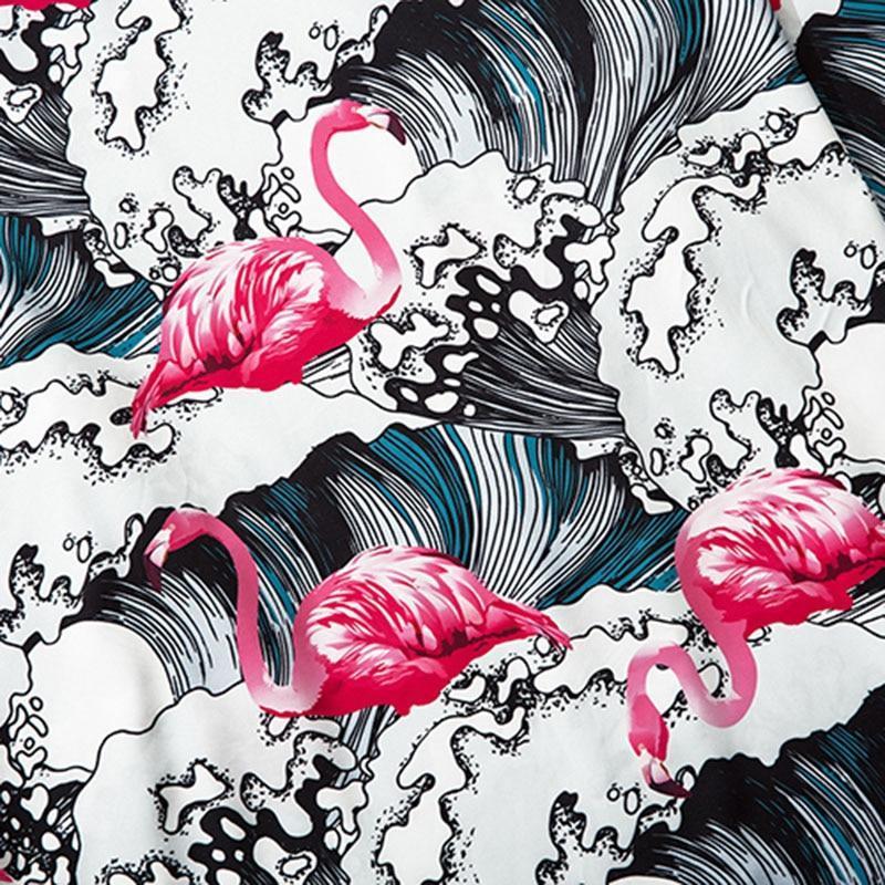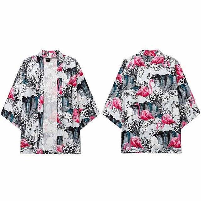 Trage stolz deinen japanischen Kimono mit rosa Flamingos. Flamingos symbolisieren Schönheit, Gleichgewicht und Anmut. Diese Vögel sind ebenfalls rosa, was unter anderem Weiblichkeit und Unschuld symbolisieren kann. Flamingos verkörpern auch Selbstbewusstsein.