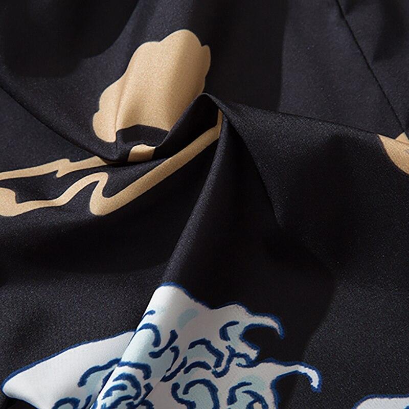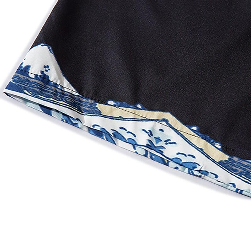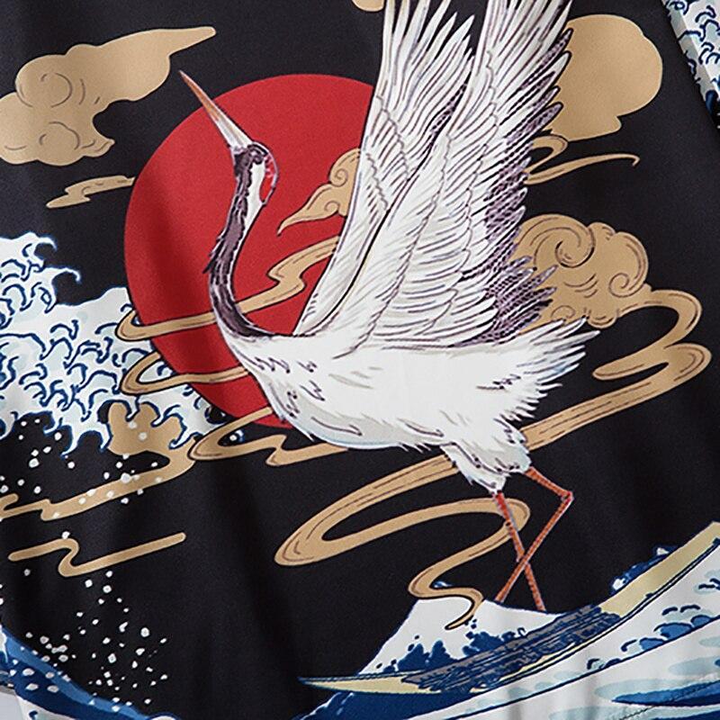 Dieser Haori-Jacke repräsentiert die Kraft und den Mut eines Kranichs. Sie thront hoch über der Kanagawa-See. Der Fuji-Berg und die aufgehende Sonne im Hintergrund geben diesem japanischen Kleidungsstück Charakter.