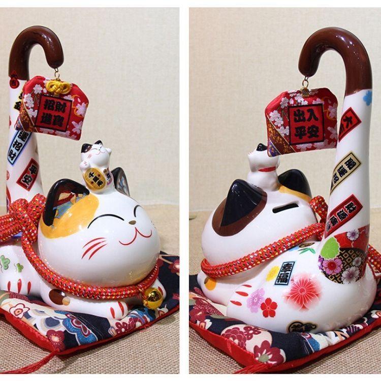 Die kleine Maneki Neko auf dem Kopf der großen Katze hält einen Koban unter ihrer Pfote, eine japanische Münze mit der Inschrift „Millionen und Millionen“. Diese Sparbüchse ist ideal, um Münzen aufzubewahren, und verleiht Ihrer Wohnkultur einen japanischen Touch.