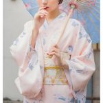Die Pastellfarben dieses Kimonos betonen die Weiblichkeit und Reinheit der Frau, die ihn trägt.