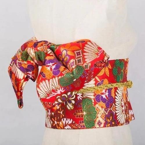 Ein farbiger Obi-Gürtel mit Blumen, um Ihr Kimono oder Yukata zu dekorieren. Diese Art von Obi-Gürtel besteht aus einem dicken Band und einem vorgefertigten Knoten, so dass er leicht anzulegen ist.