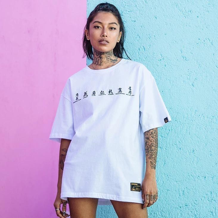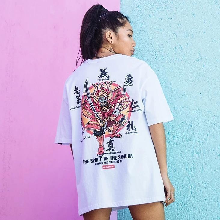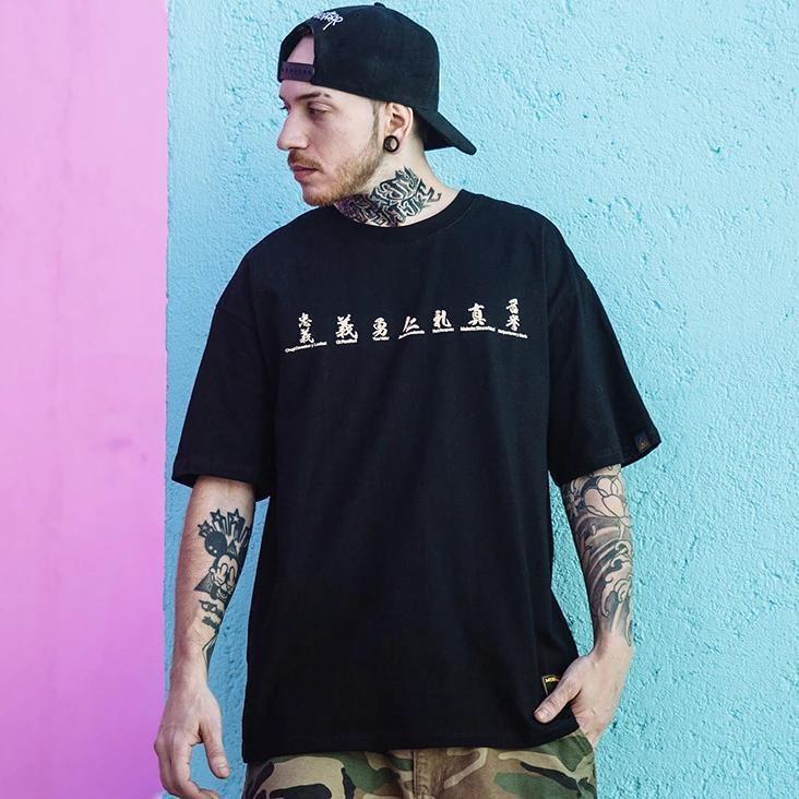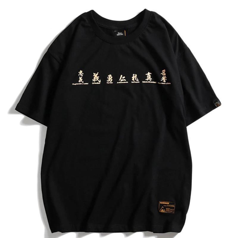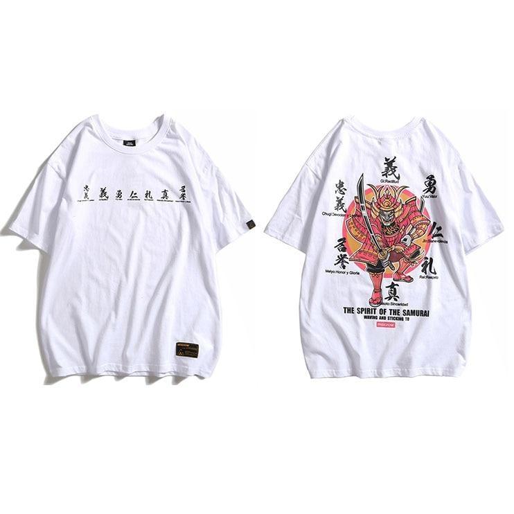 Ein T-Shirt mit japanischem Druck mit Samurai-Zeichnungen und Kanji, die ihre Werte repräsentieren:
