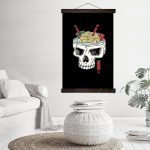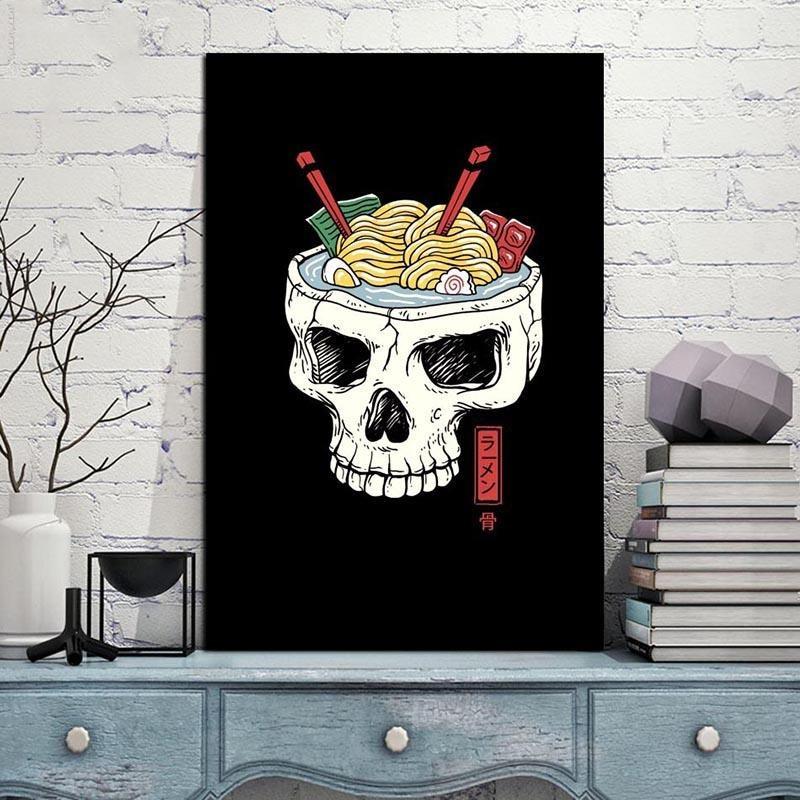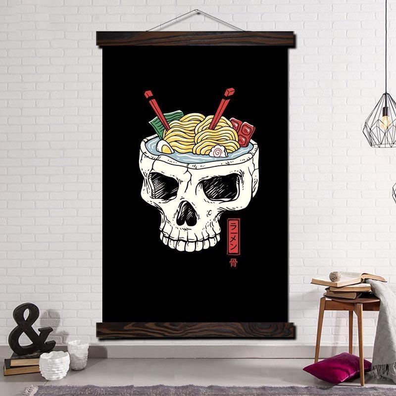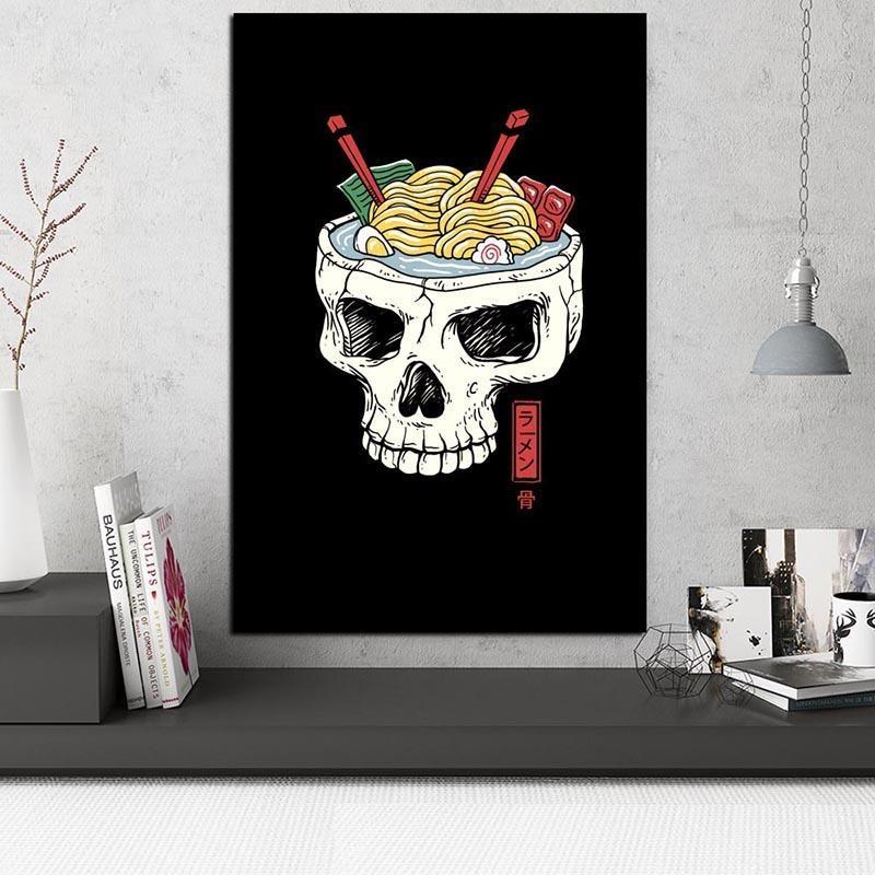 Wagen Sie sich an eine originelle und kreative Wanddekoration mit diesem japanischen Gemälde und seinem Schädel, der als Ramen-Schüssel dient.